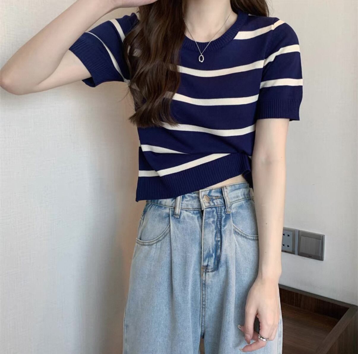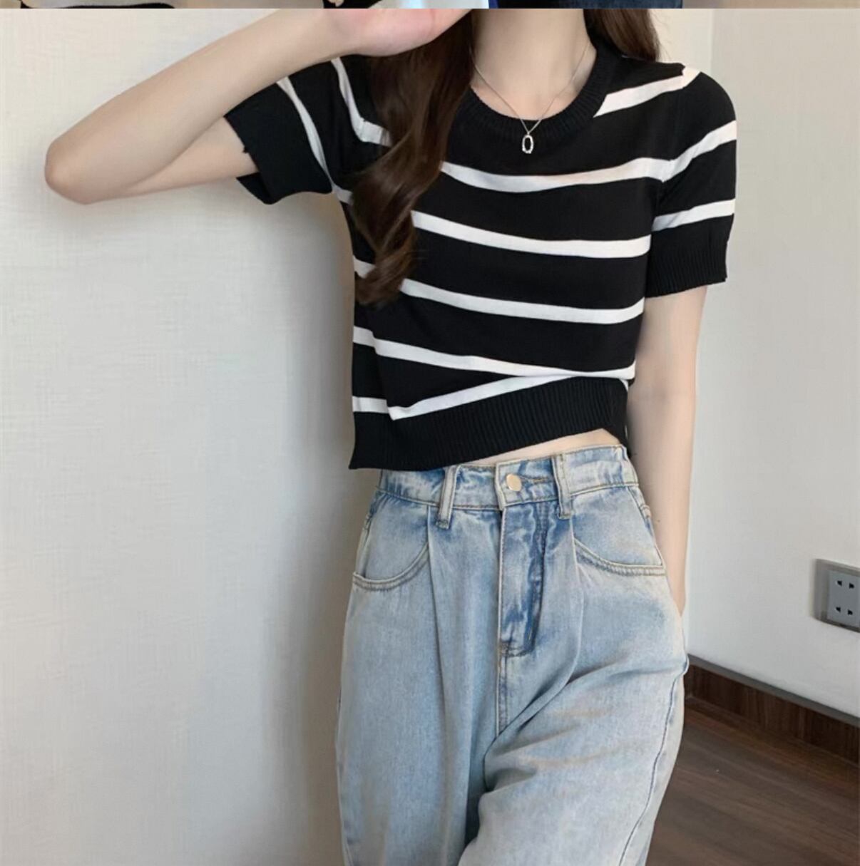毎日のスタイルにぴったりな【新作】ストライプトップス アイスシルクニット ハイウエストTシャツ!このアイテムは、涼しげなアイスシルク素材とスタイリッシュなストライプデザインが特徴で、春夏のお出かけやカジュアルなコーディネートに最適な一品です。着ることで、あなたのスタイルを一層引き立てます!
