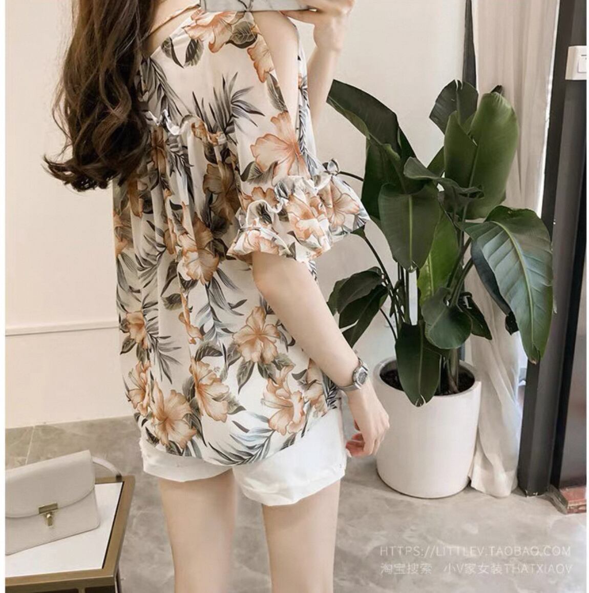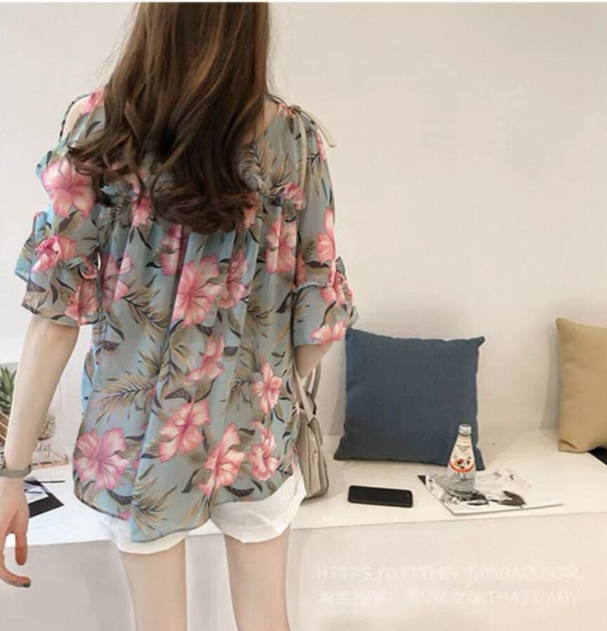 フレアスリーブオフショルダー 花柄スリムシャツ