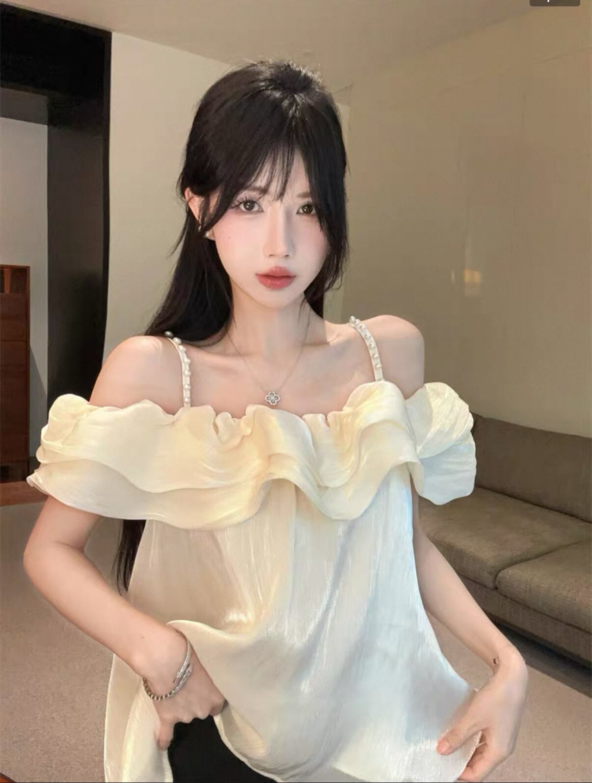 ワンショルダーフリルサテンシャツ 上品感
