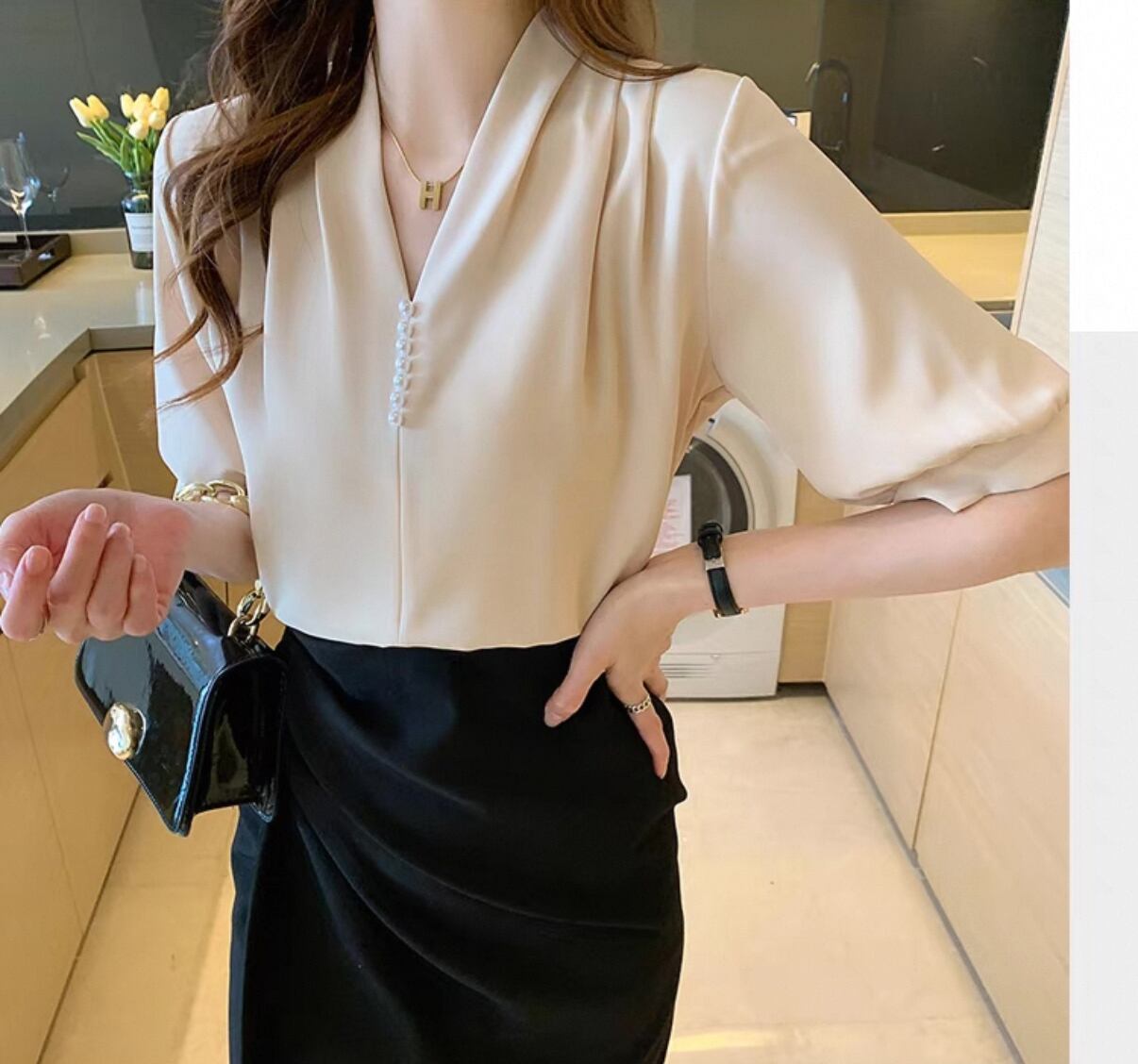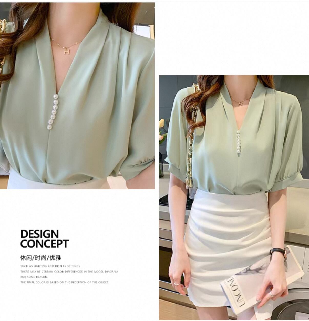 毎日のスタイルにぴったりな【シフォン半袖シャツ Vネックピンビーズ】が登場!このアイテムは、軽やかな着心地とエレガントなデザインを兼ね備えており、夏のコーディネートに欠かせない一着です!