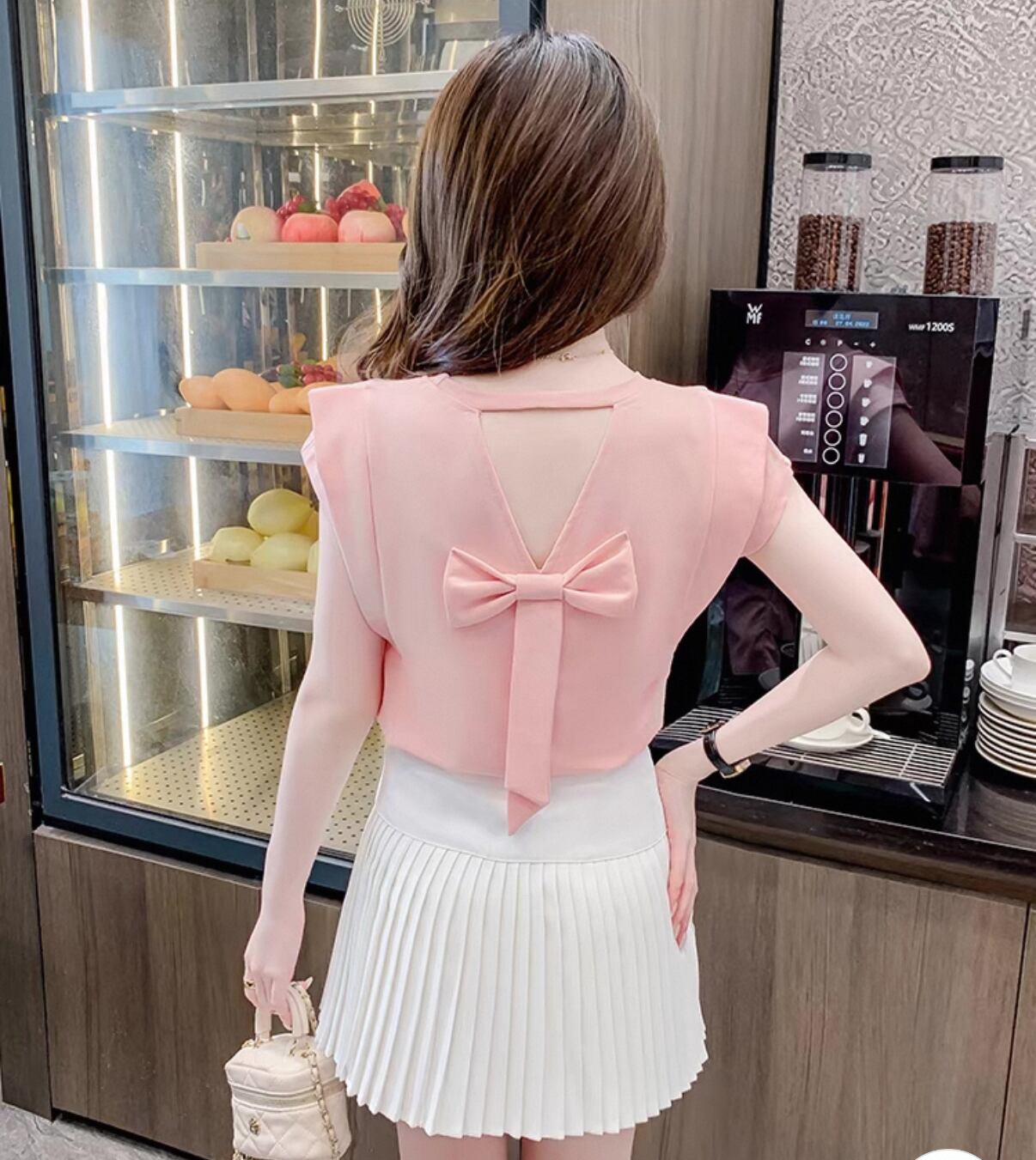 ・背中のリボンが可愛らしさを引き立て、女性らしい印象をプラス。一枚でコーディネートの主役になれるデザインです!ショート丈だから、ボトムスとの相性も良く、スタイリングの幅が広がります。