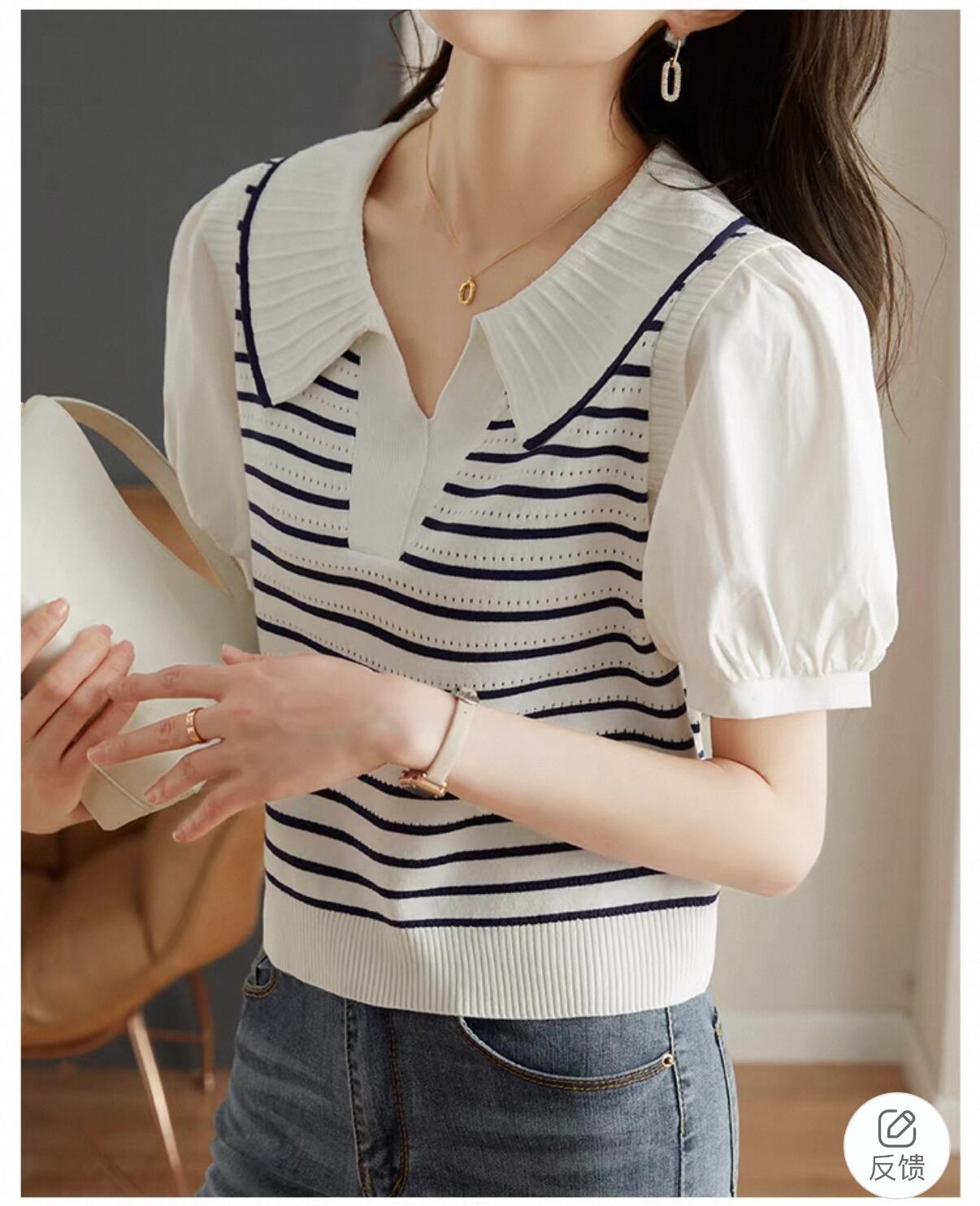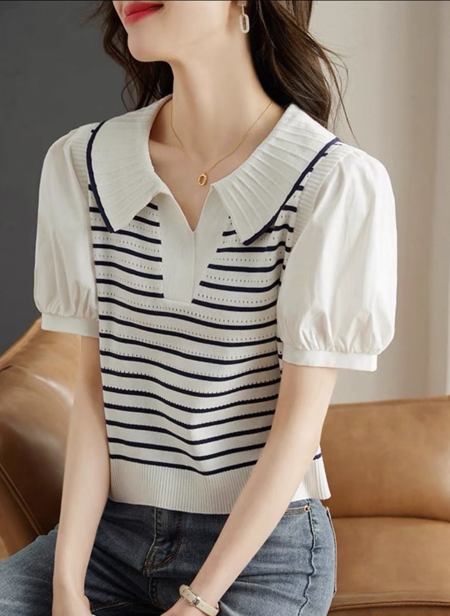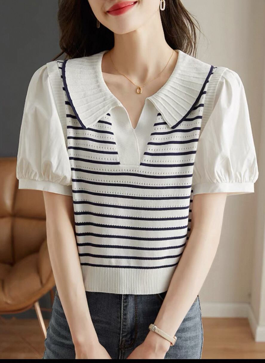 【新作】ドールネックパフスリーブ ストライプTシャツ