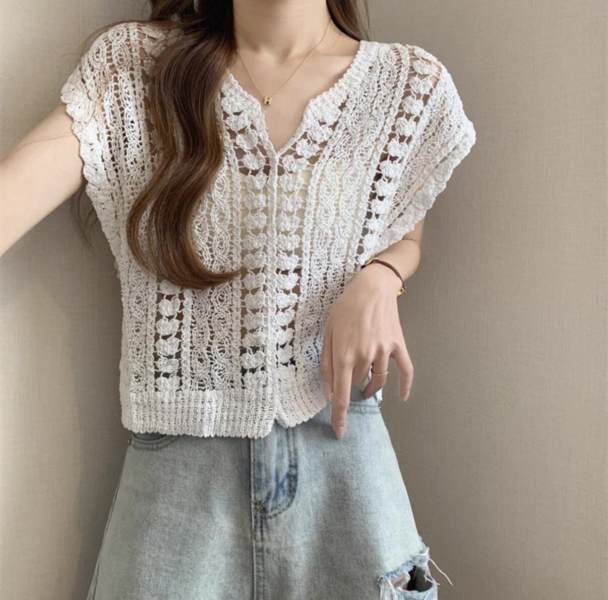 ・このニットベストは、スケルトン仕様でありながら、しっかりとした編み地が魅力です!軽やかで通気性も良く、これからの季節のコーディネートに最適です。