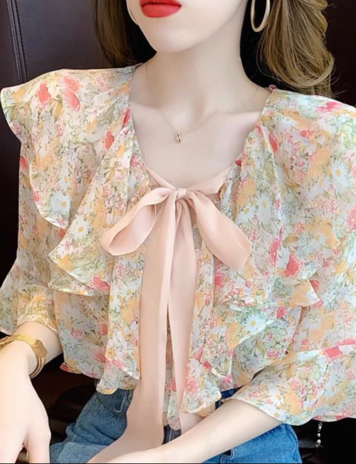 新たなシーズンにぴったりな【フリル半袖 シャツ 花柄】が登場!このアイテムは、かわいらしいフリルと華やかな花柄デザインが特徴で、あなたのスタイルを一層引き立てます!