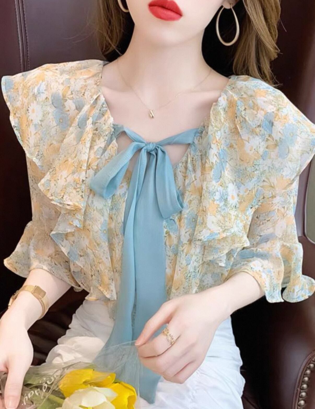 フリル半袖 シャツ 花柄