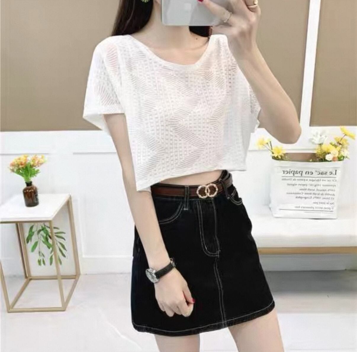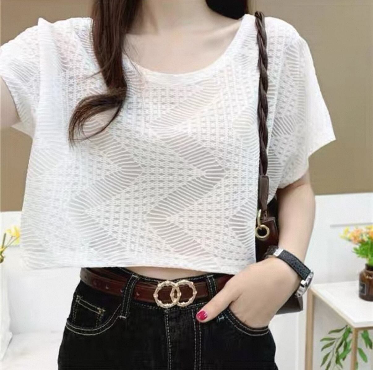 新たなシーズンにぴったりな【短め トップス レース スケルトン Tシャツ】が登場!このアイテムは、フェミニンなレースディテールと透け感のあるスケルトンデザインが特徴で、あなたのスタイルに華やかさとおしゃれな魅力をプラスします!