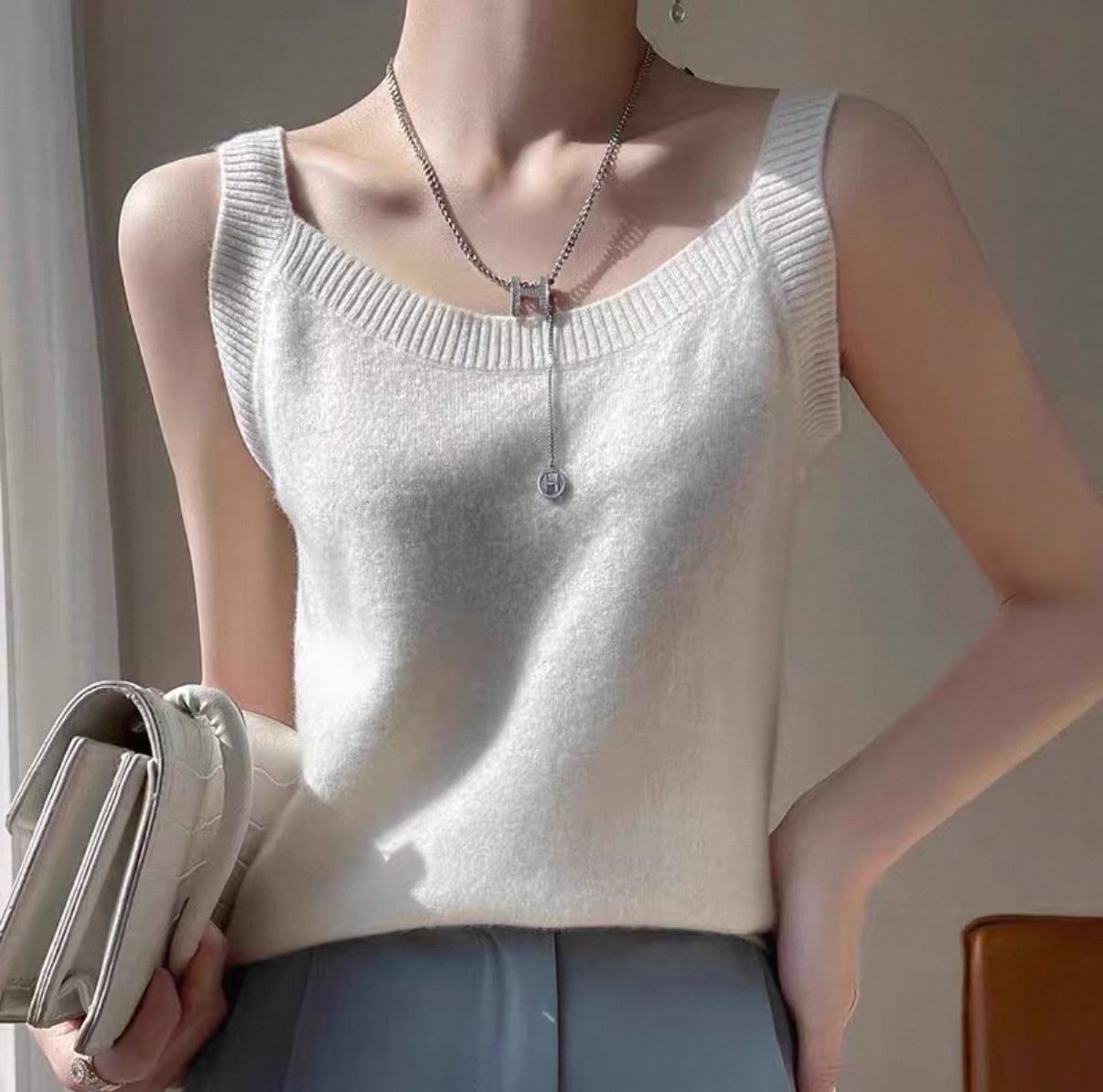 ・このアイスシルク ニット ノースリーブ インナー トップスは、軽やかな素材感で着心地も抜群。肌に優しく、さらっとした触感が特徴です。ノースリーブデザインは、これからの季節にぴったりで、カジュアルなボトムスはもちろん、スカートと合わせることで、より一層お洒落に決まります。シンプルながらも洗練されたスタイルを楽しんでください!