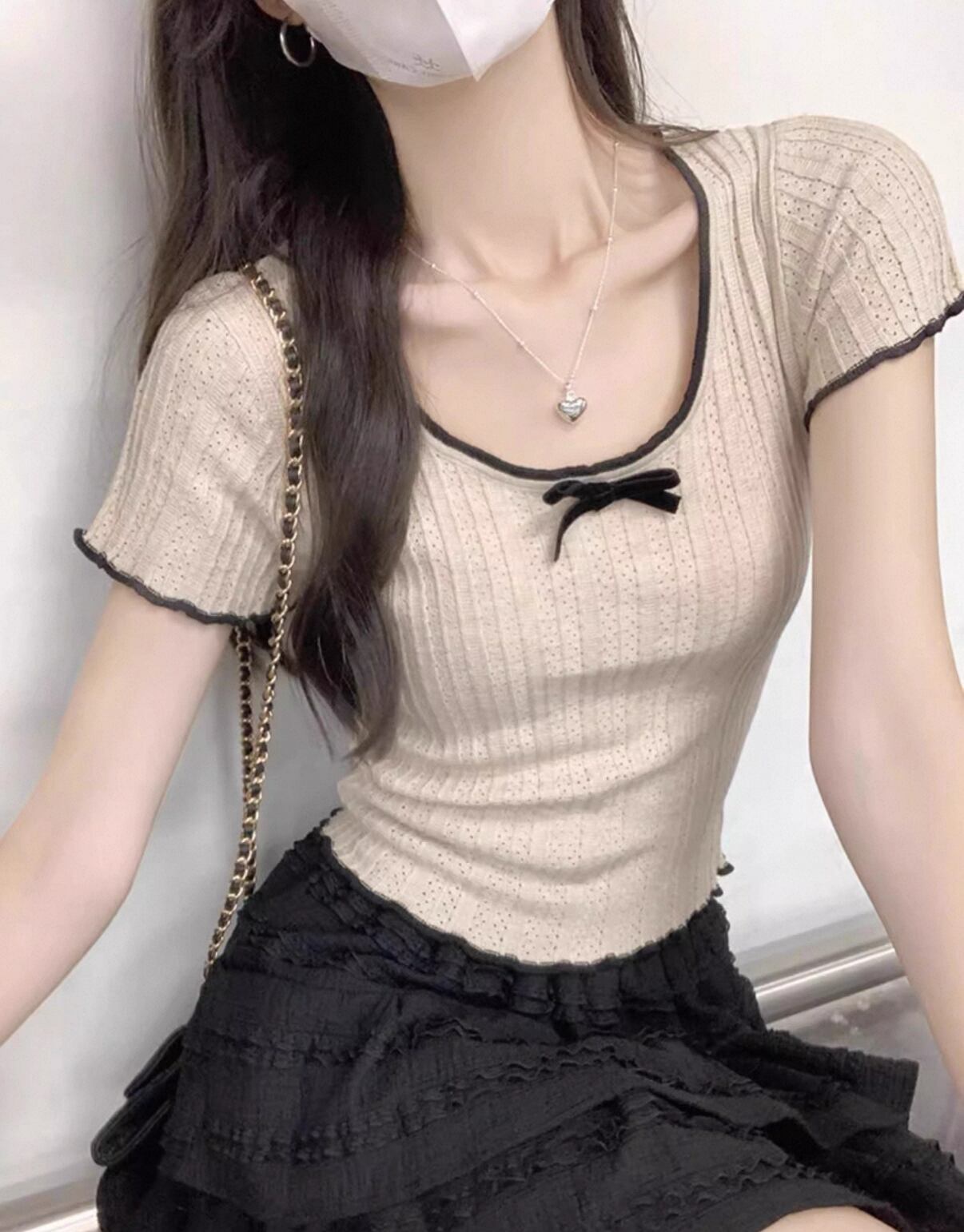 新たな季節にぴったりのアイテム【フレンチ風 リボン付き シルクニット Tシャツ】が登場!この商品は、フレンチ風のデザインとリボン付きのあたたかみが特長で、普段使いから特別なお出かけまで、幅広く活躍することが期待されます!