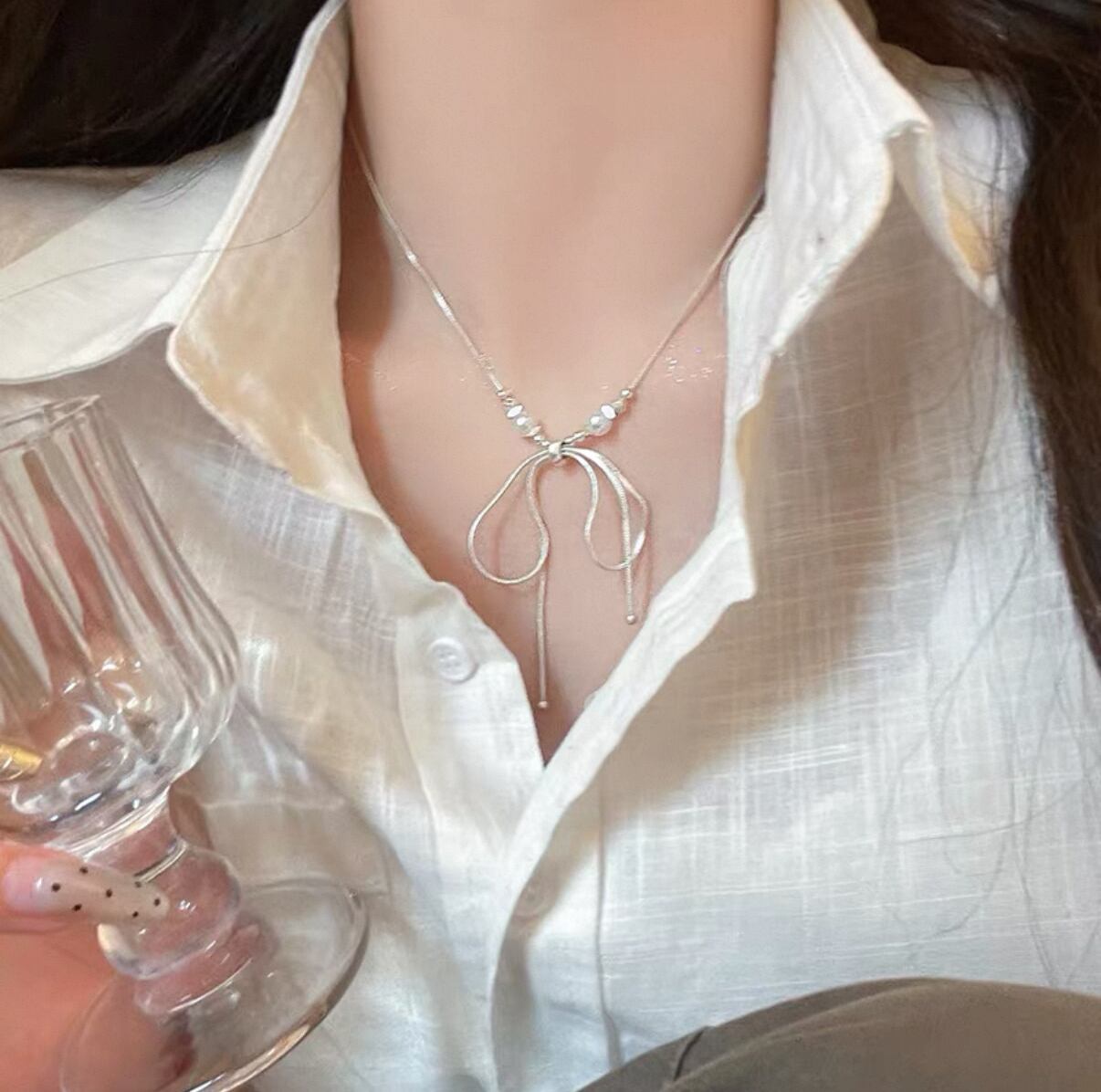 ・このネックレスは、華奢なシルバーリボンが美しく、さりげなくあなたの魅力を引き立てます!パールの柔らかな光沢が首元を華やかに彩り、どんなスタイルにもマッチしやすく、女性らしさを一層引き立ててくれる非常に魅力的なアイテムです。