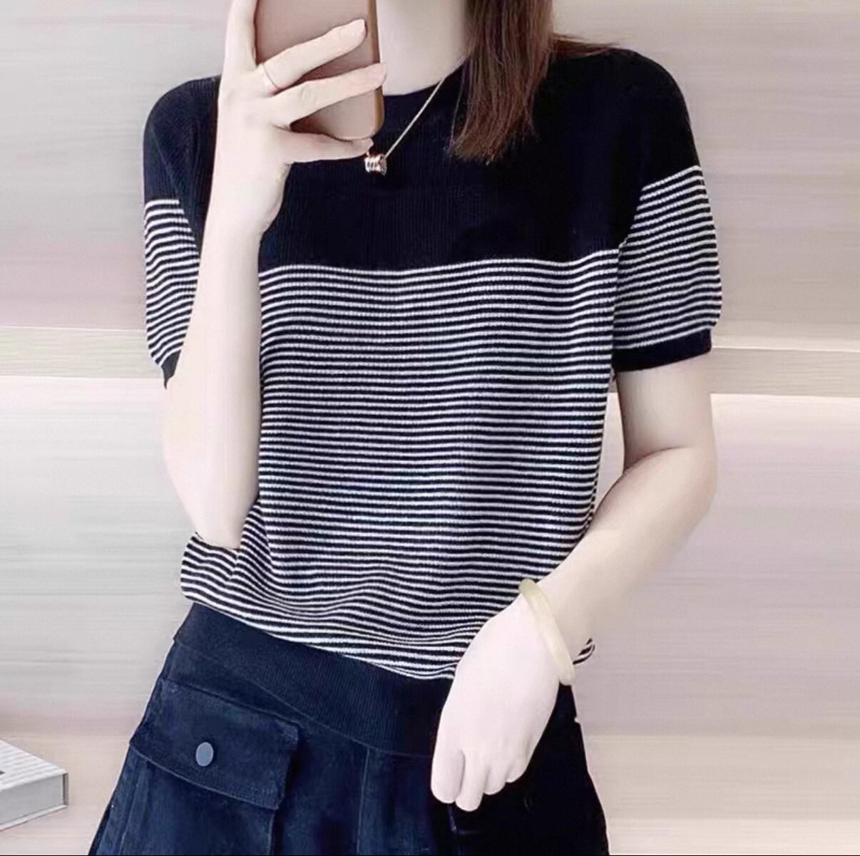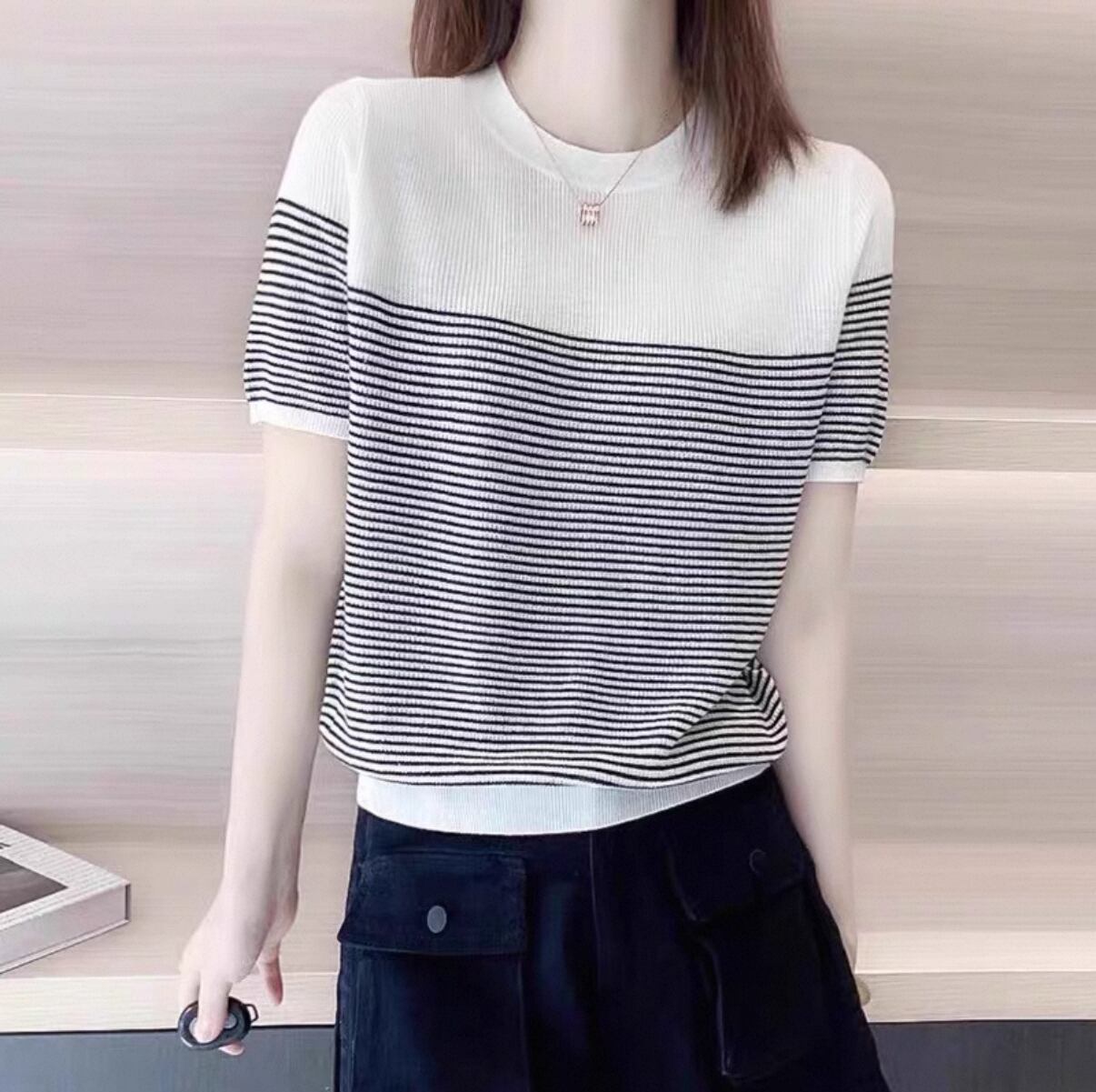 **上品さをプラス!ストライプ ラウンドネック アイスシルクニット Tシャツが新たに登場!**
