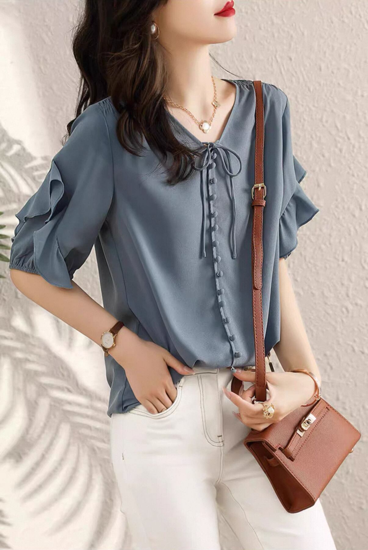このシフォンシャツは、柔らかなシフォン素材と洗練されたフレアスリーブデザインが特徴のアイテムです。通勤シーンはもちろん、様々なお出かけにも最適で、あなたの魅力をぐっと引き立てます!