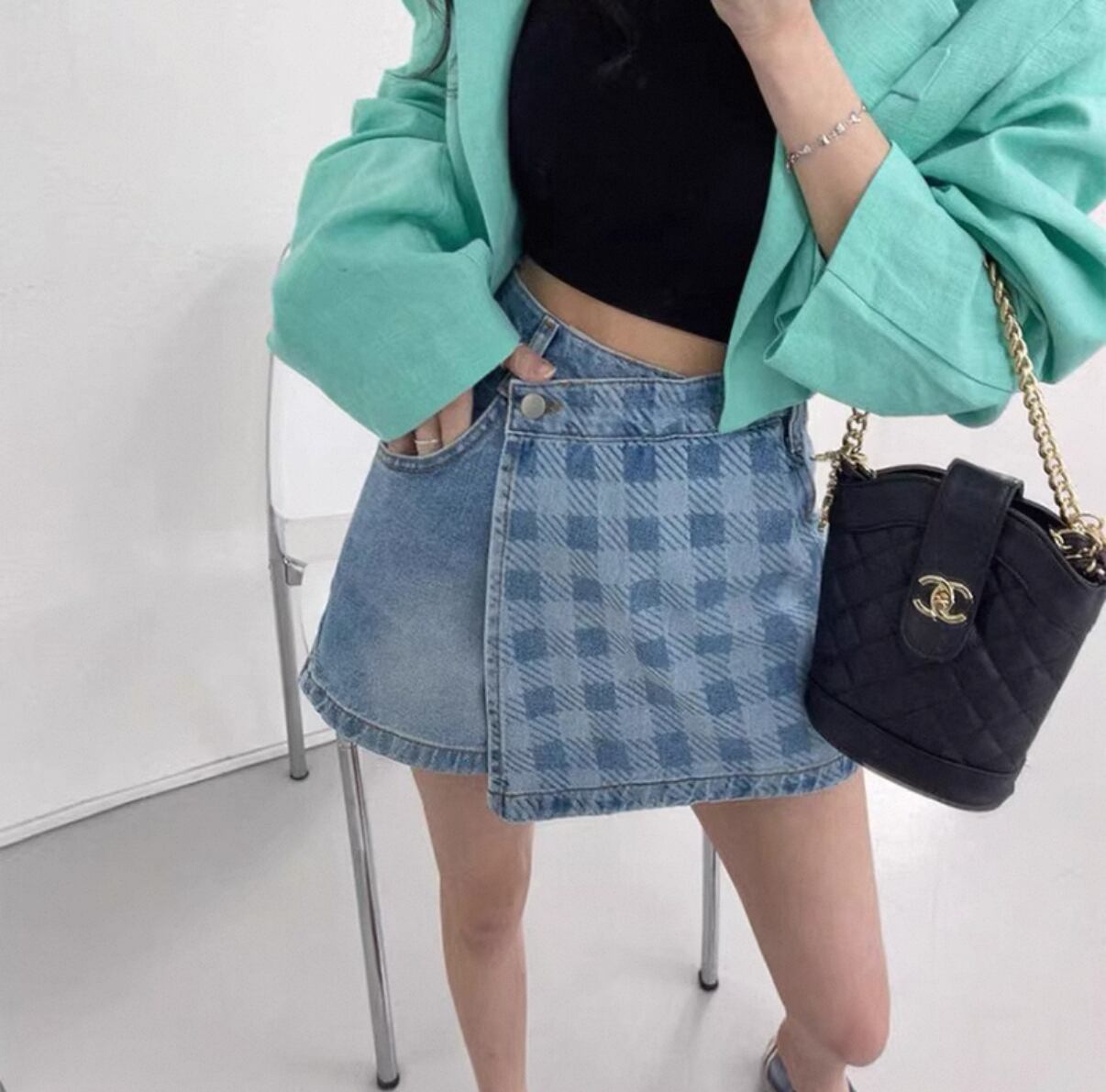 **トレンドを押さえたスタイルが叶う!不規則チェック柄 デニムショートパンツ ハイウエストが新登場!**