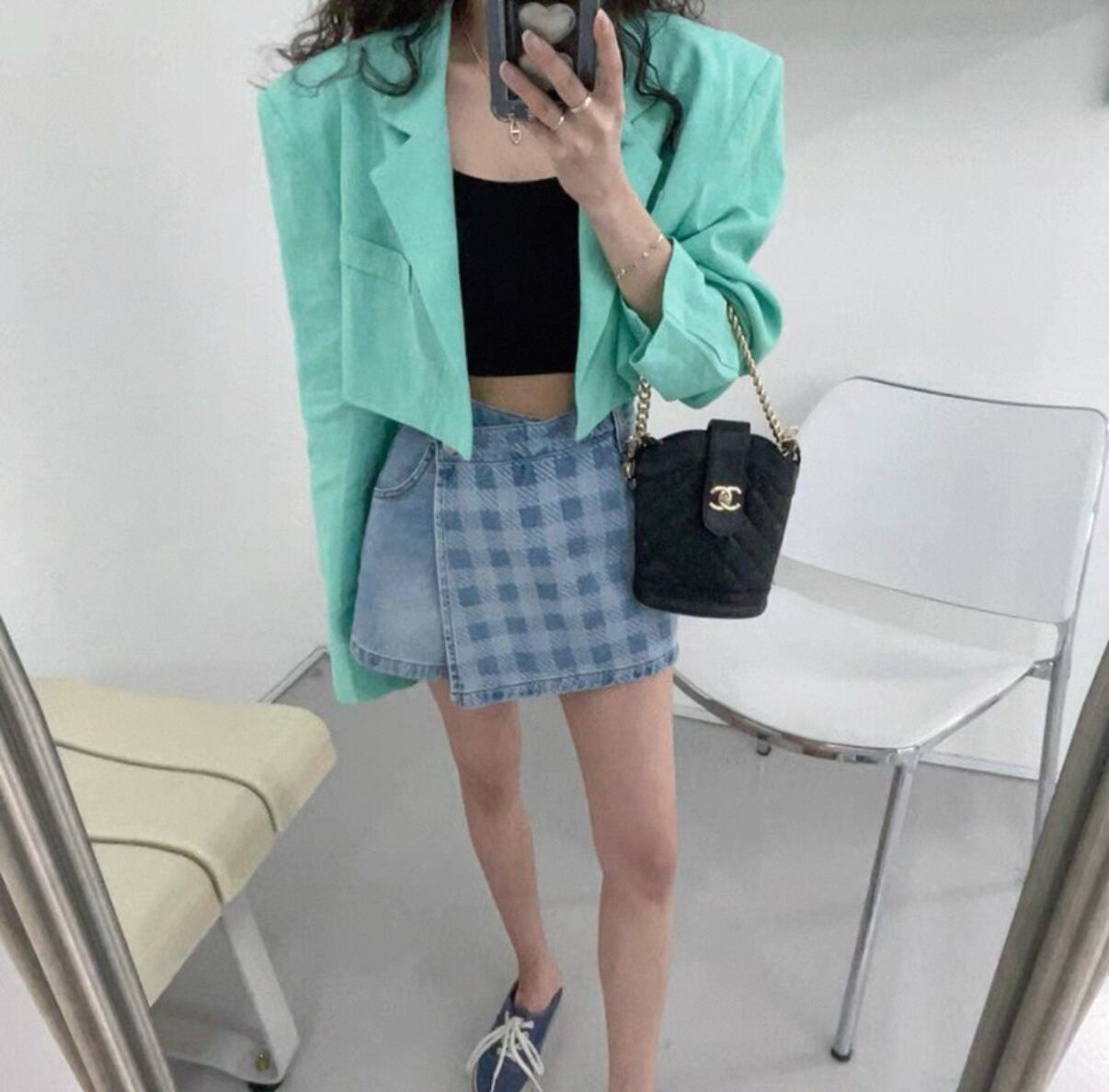 不規則チェック柄 デニムショートパンツ ハイウエスト