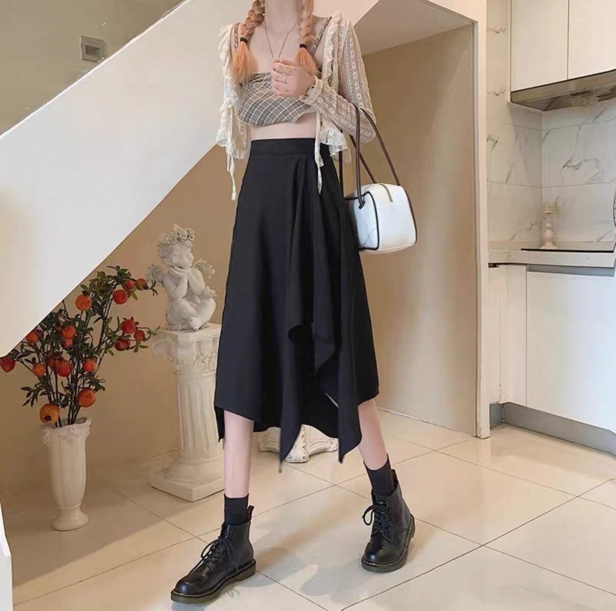 ・このスカートは、アシンメトリーのディテールが目を引き、Aラインのシルエットがスタイルを美しく見せるポイントです。動きやすさを大切にしたデザインで、特にシンプルなトップスやブラウスとのコーディネートが楽しめます。デイリーファッションからおしゃれなお出かけまで、さまざまなシーンでの活躍が期待できるアイテムです。ぜひこのスカートを取り入れて、あなたのスタイルを洗練されたものにアップデートしてみてください!