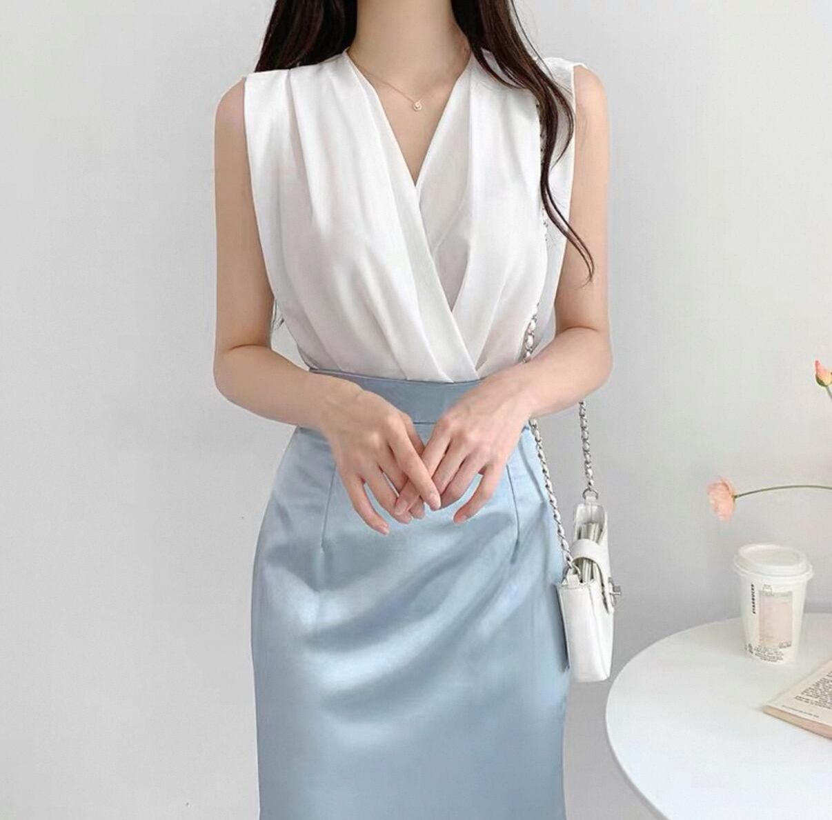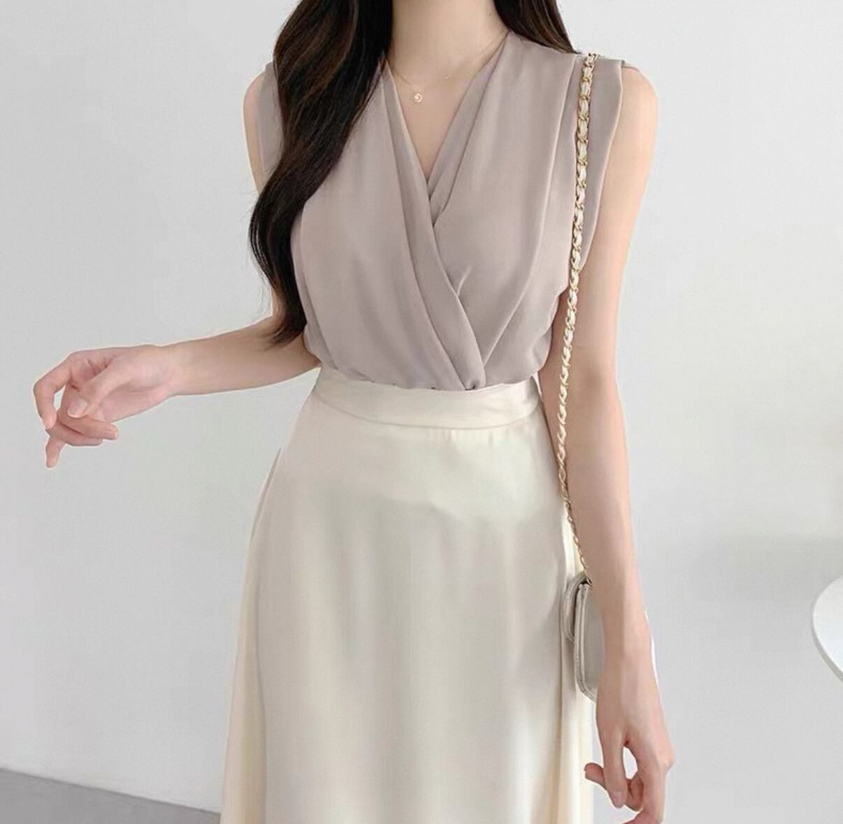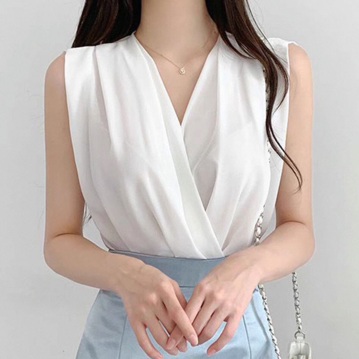 ・このノースリーブは、Vネックとクロスデザインが特徴で、軽やかな印象を与えます。ゆったりとしたシルエットは快適な動きやすさを実現し、ビジネスシーンでもカジュアルなシーンでも活躍します。ぜひこのアイテムを取り入れて、あなたのスタイルをさらに魅力的に演出してみてください!