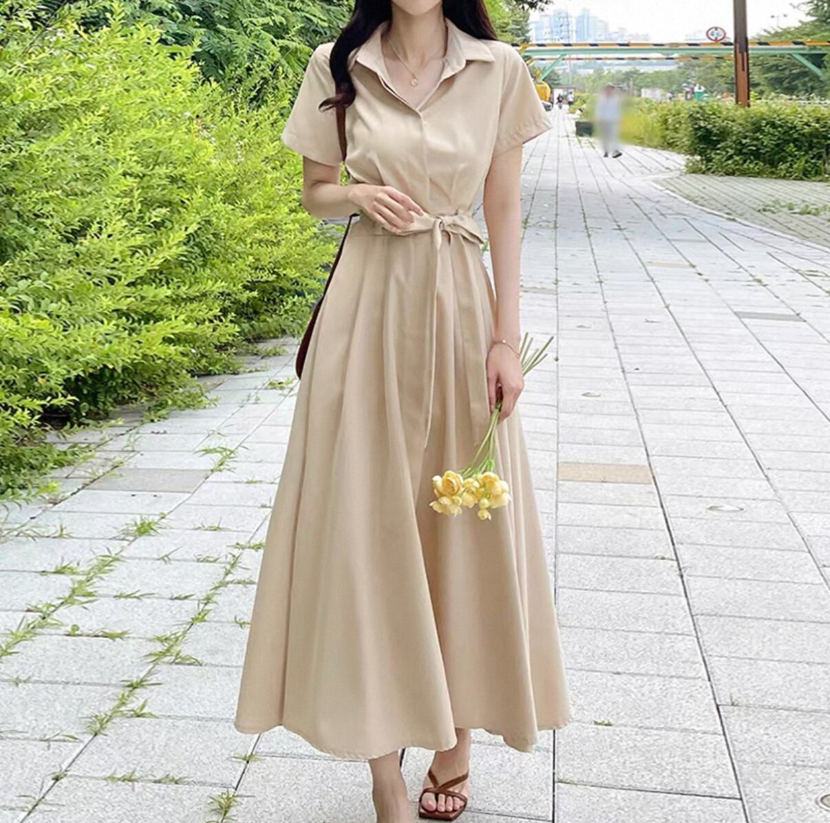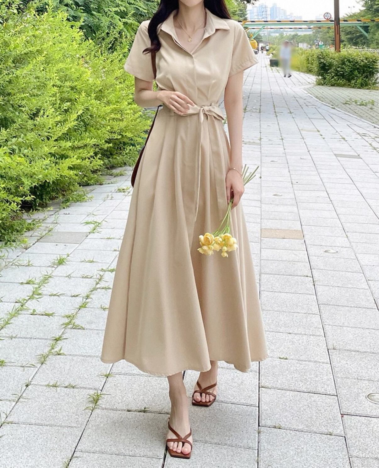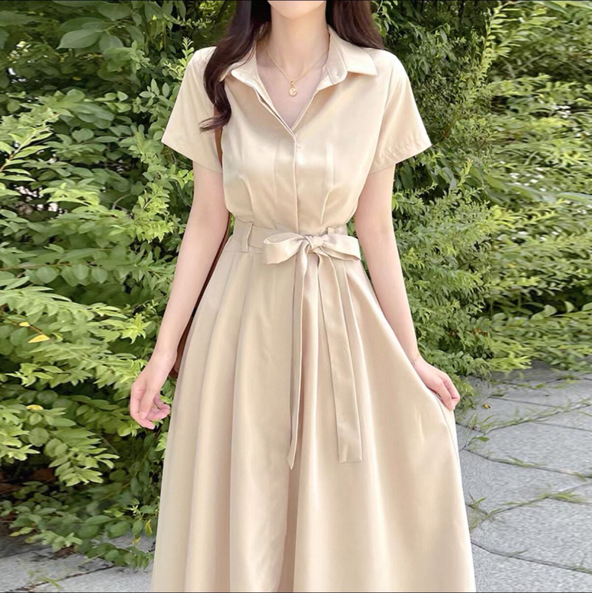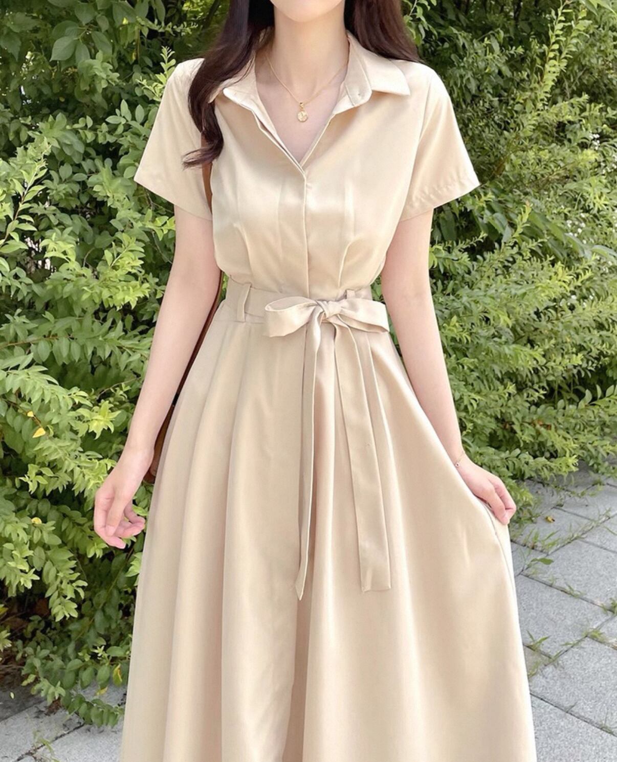 高級感 シャツワンピース 半袖 ロングスカート