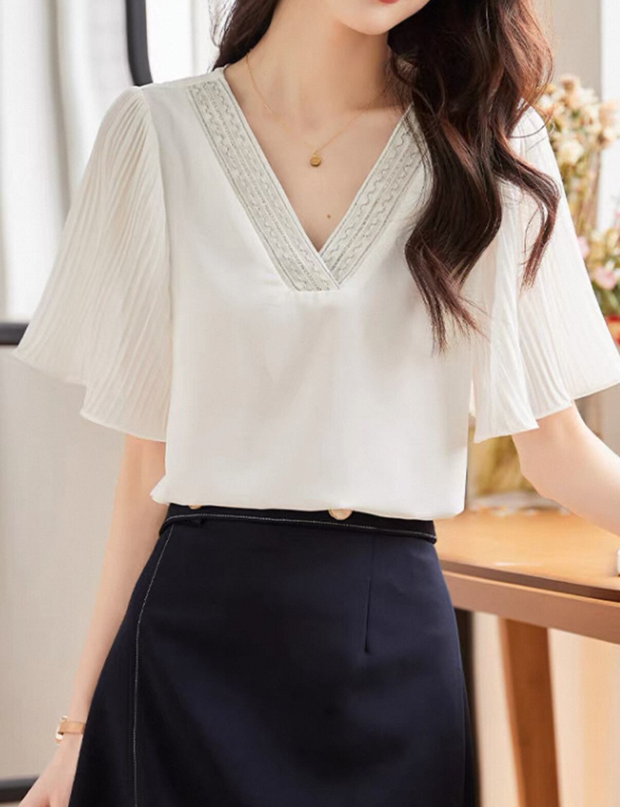 Vネックフレアスリーブ シフォンシャツ 半袖 通勤 オフィス