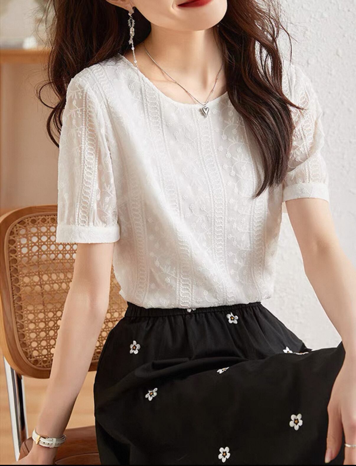 ・このシャツは、繊細なジャカードレースが施されており、上品な印象を与えます。軽やかな素材を使用しているため、快適な着心地を実感できます。パンツやスカートとの組み合わせも抜群で、オフィスシーンやデートなど、さまざまなシーンでおしゃれに決まります!このシャツを着て、毎日のコーディネートをさらに楽しんでください!