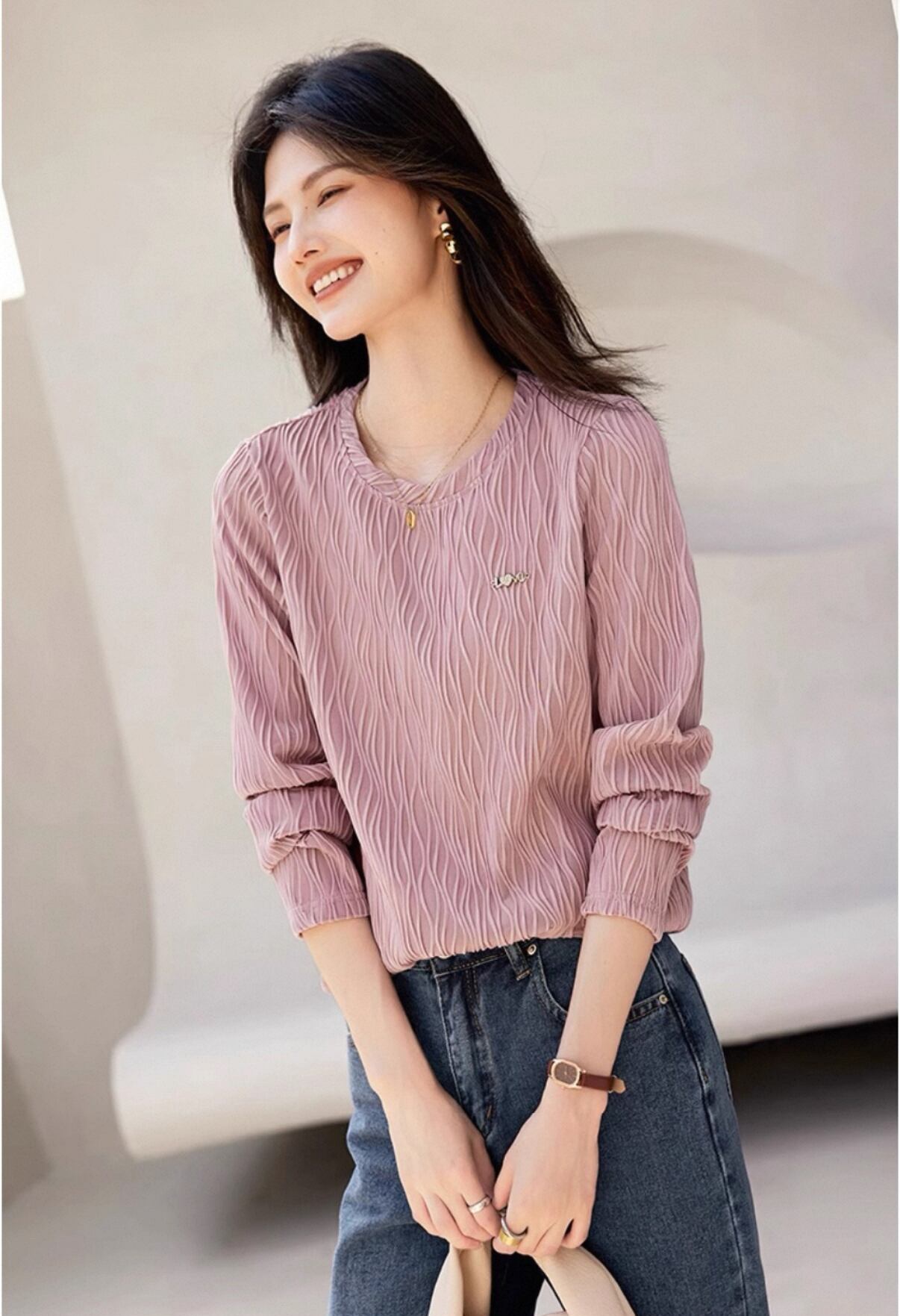 この波形の質感が特徴の無地長袖Tシャツは、シンプルながらも印象的なデザインが魅力のアイテムです!多様なシーンに対応できるため、オフィスカジュアルから週末のお出かけまで幅広く活用できます。