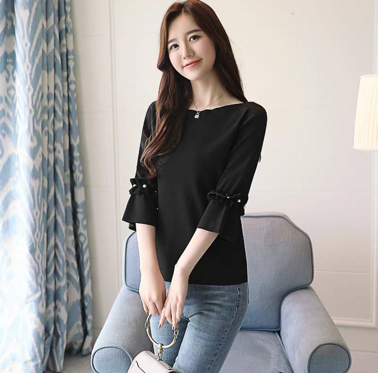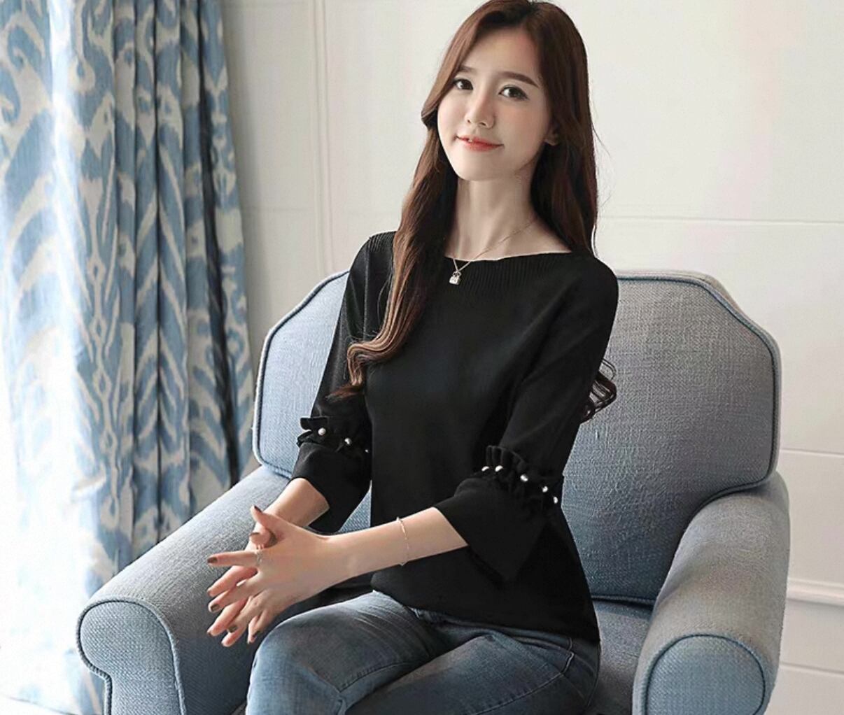 **洗練されたスタイルを引き立てる!プルオーバーボトルニットシャツ フレアスリーブ ブラックが新登場!**