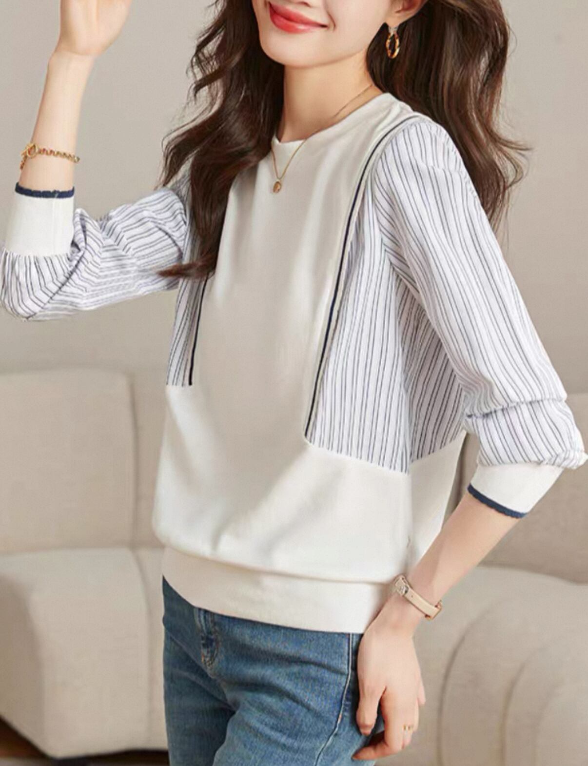 【New】ストライプ 長袖ステッチ ラウンドネック