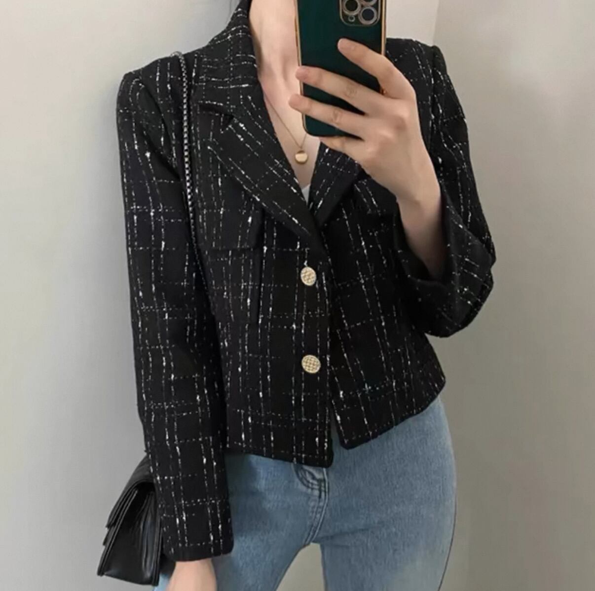 **スタイリッシュで存在感抜群の一着!チェック柄 ショートジャケット 二粒ボタンが新登場!**