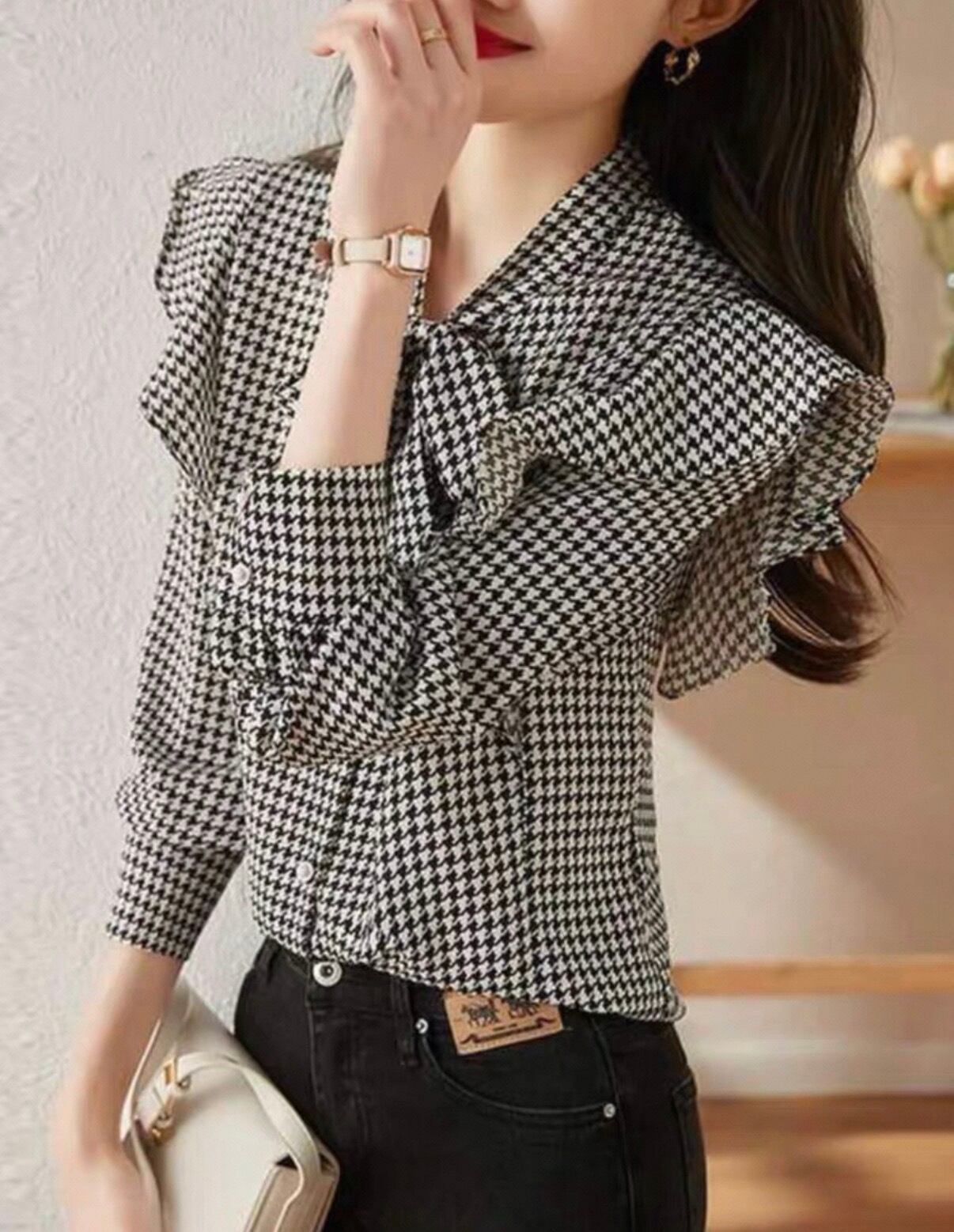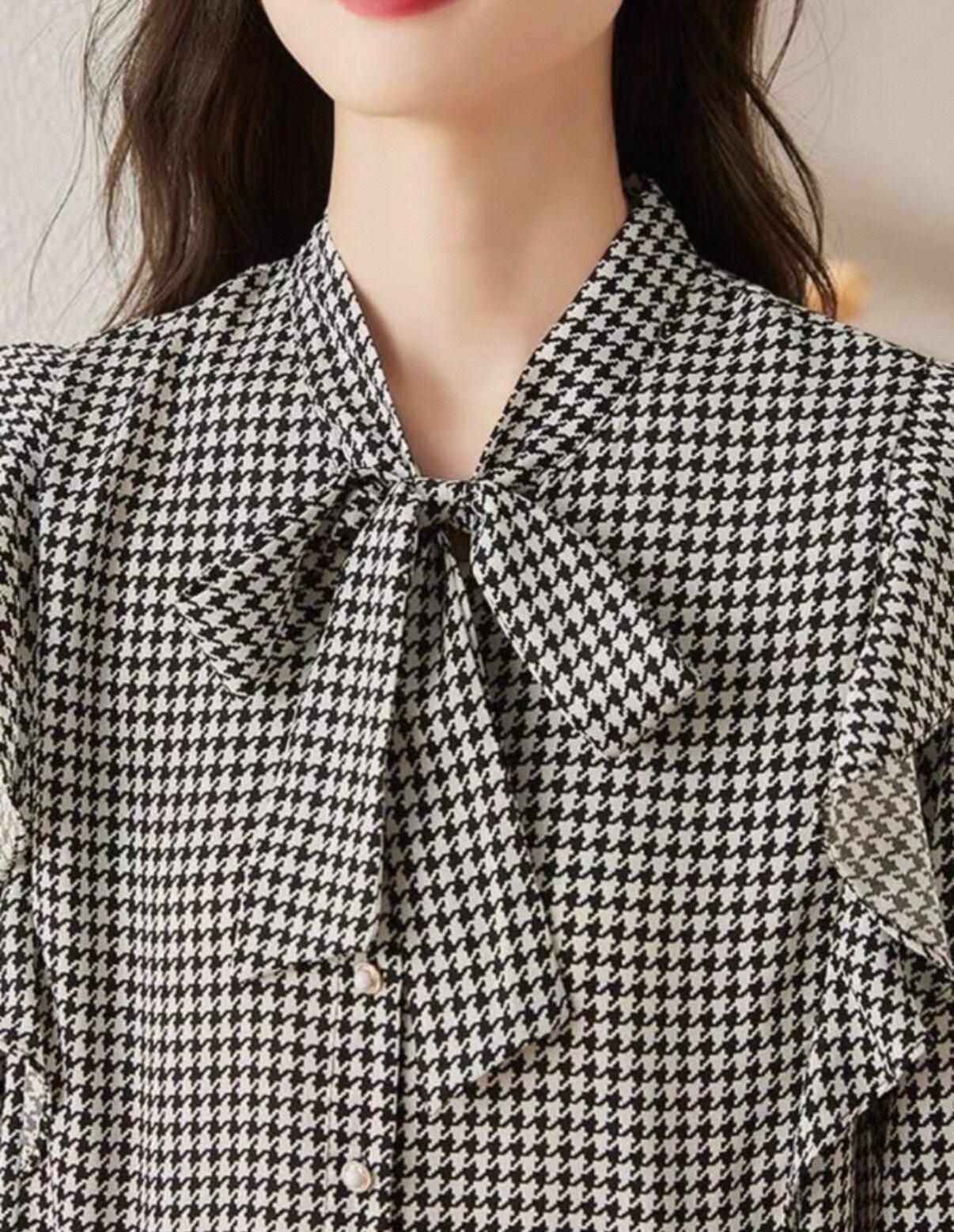 **おしゃれと可愛さを兼ね備えた!千鳥柄 大きめリボンシャツが新登場!**